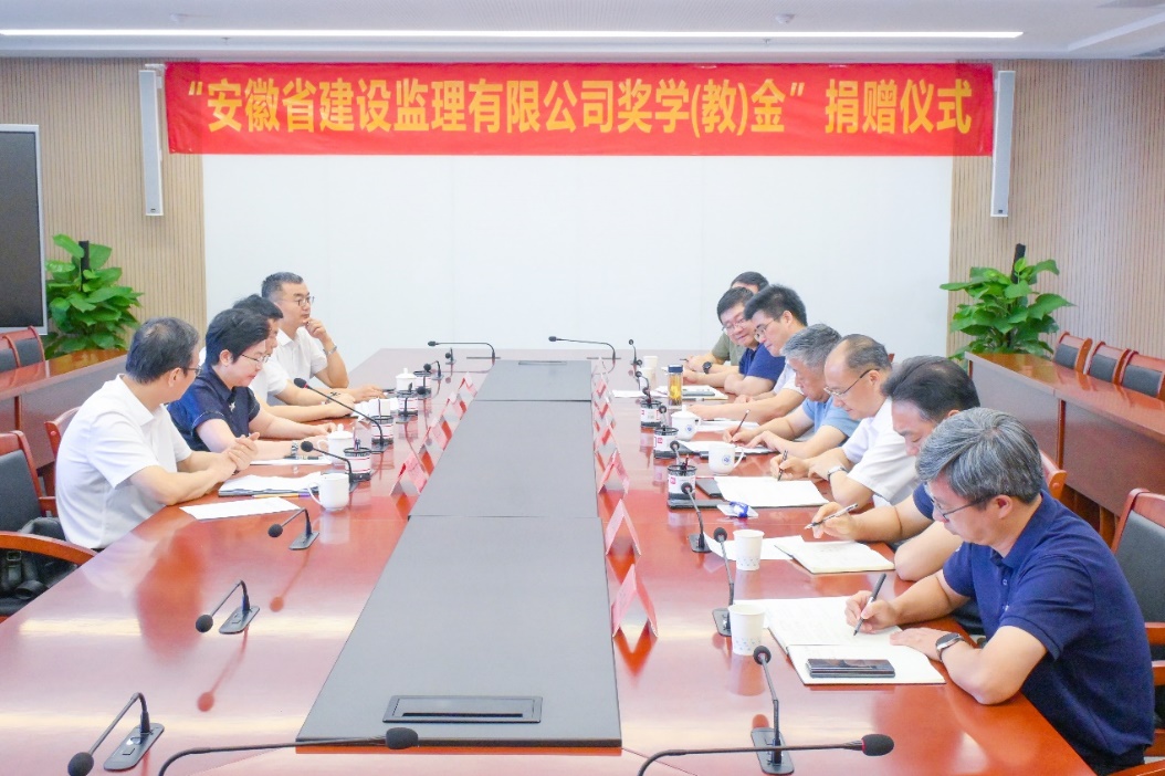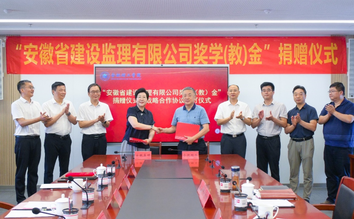 2025年9月17日,“安徽省建设监理有限公司奖学(教)金”捐赠暨校企战略合作协议签订仪式在bat365行政综合楼第一会议室举行。校党委副书记、校长吴玉程,校筹备组副主任吴明在,安徽省建设监理有限公司(以下简称“安徽监理”)总经理朱仁芳、副总经理苏立新、副总经理陈永新、总经理助理王新闻出席捐赠和签约活动,仪式由校党委副书记、副校长李先强主持。