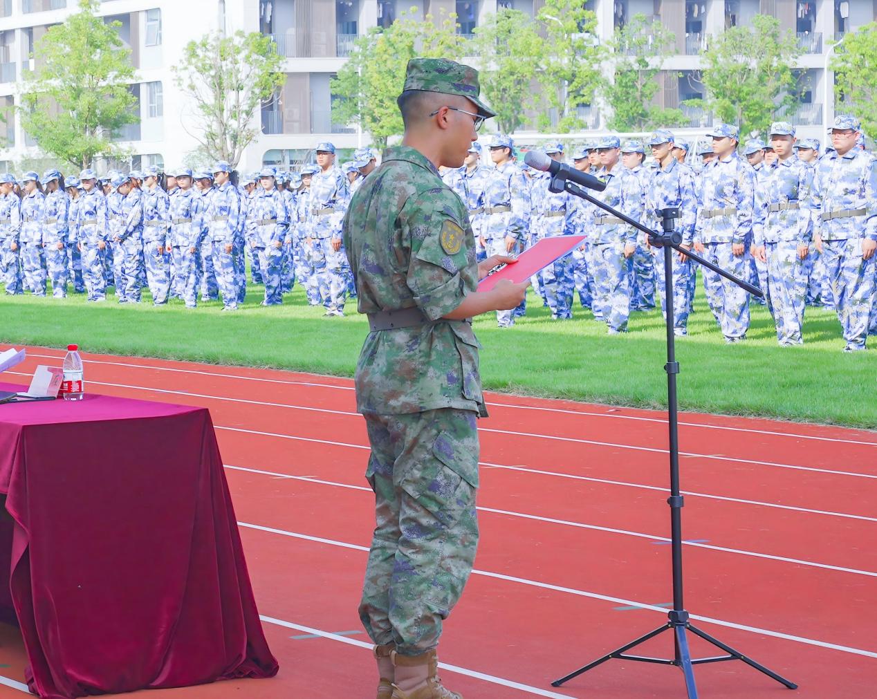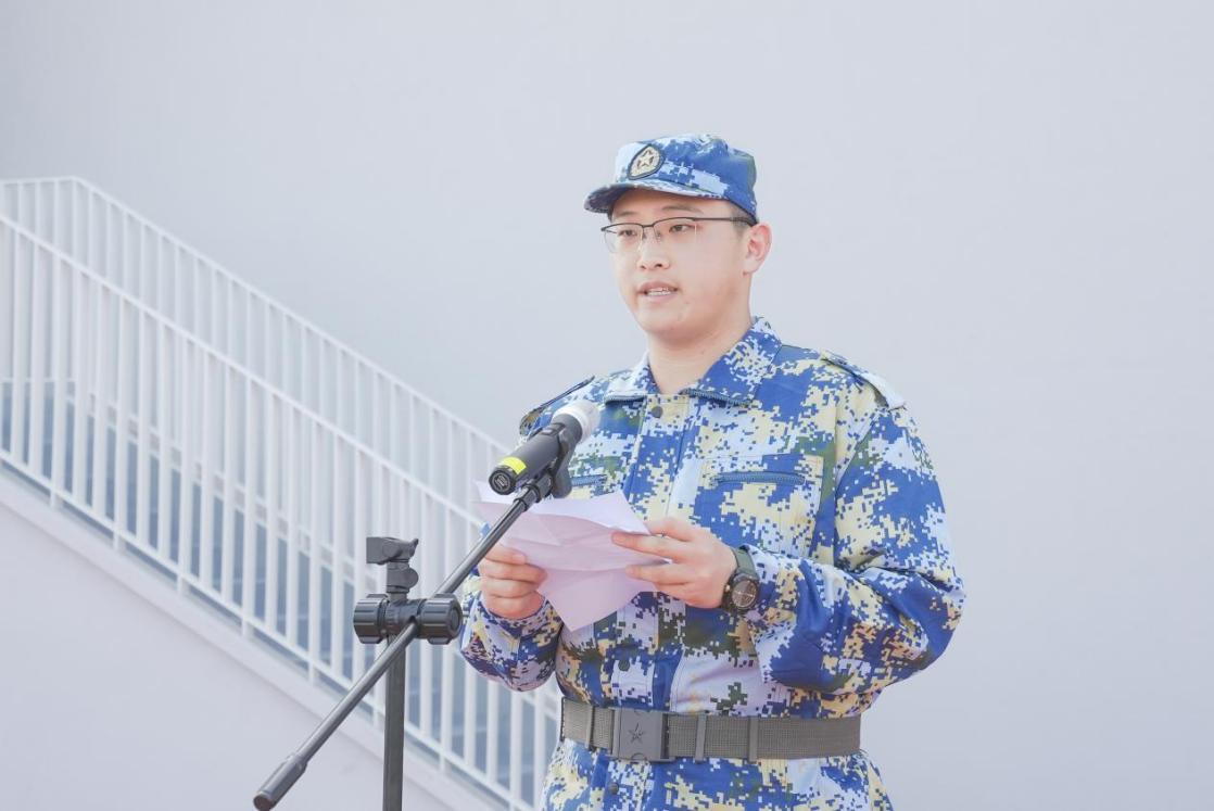 刘奕铭作为参训新生代表发言,表示在接下来的训练中,将以军人的标准严格要求自己,服从命令、听从指挥,突破自我、诠释担当,以积极的姿态、坚韧的意志迎接挑战,为大学生涯打下坚实基础。