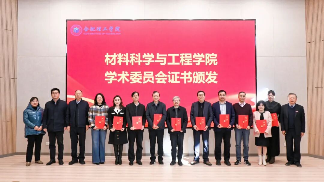 吴玉程为第一届材料科学与工程学院学术委员会委员颁发聘书。中国科学技术大学李晓光教授担任学术委员会主任委员,中国科学院固体物理研究所孟国文研究员担任副主任委员,南京大学胡征教授、中国科学技术大学尤业字教授、浙江大学朱铁军教授、苏州大学李亮教授、四川大学张楚虹教授、河南师范大学高书燕教授、材料科学与工程学院余彦教授和刘家琴教授担任委员。