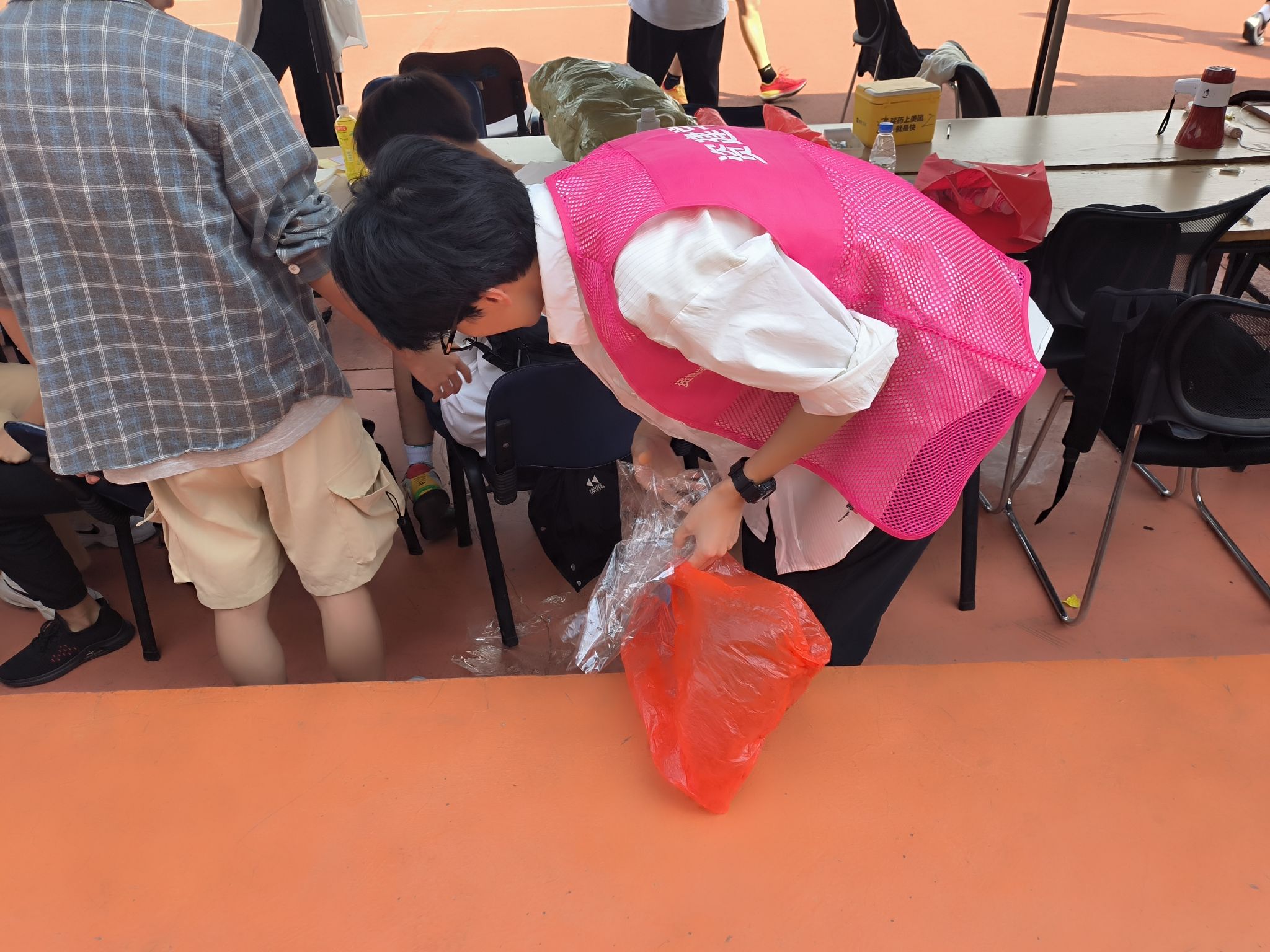 此次志愿服务中,学生党员和入党积极分子身穿红马甲,活跃于整个田径场。哪里有需要,哪里就有志愿者们的身影。志愿者们分工明晰,布置有序,全力做好运动员志愿服务保障工作。通过前期安排志愿者与运动员项目的对接工作,确保运动员顺利检录;同时为运动员提供暖心服务包,收纳运动员物品,准备运动员用水,确保运动员能安心比赛;为师生运动员呐喊助威,关心关注运动员赛后状态;拍照记录运动员的精彩瞬间,维护田径场的干净整洁,以饱满的热情做好本次志愿者服务工作,为师生运动员做好了后勤服务保障。