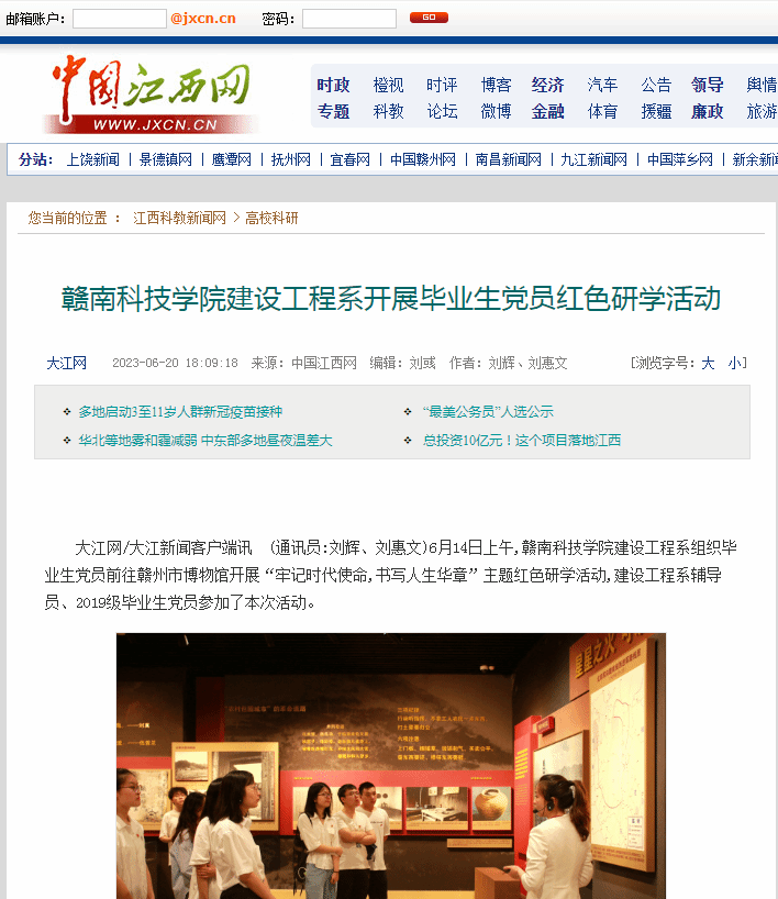 大江网/大江新闻客户端讯:6月14日上午,bat365中文官方网站建设工程系组织毕业生党员前往赣州市博物馆开展“牢记时代使命,书写人生华章”主题红色研学活动,建设工程系辅导员、2019级毕业生党员参加了本次活动。