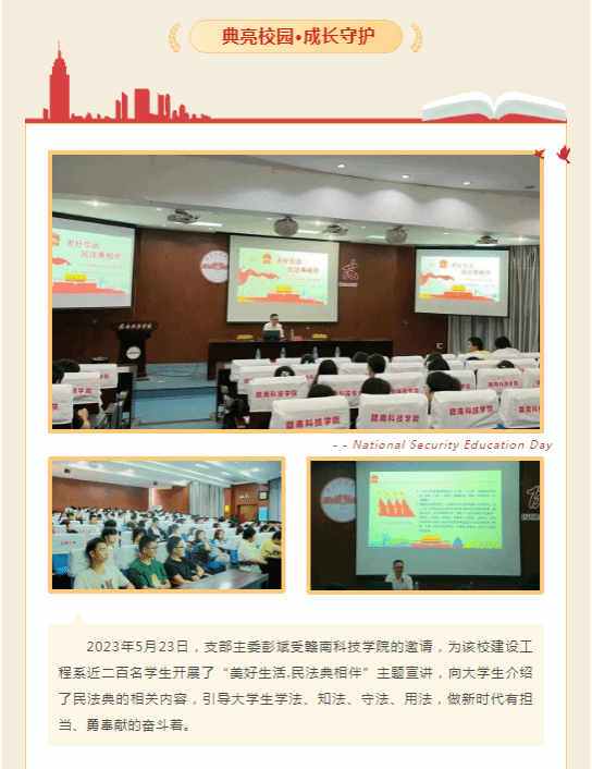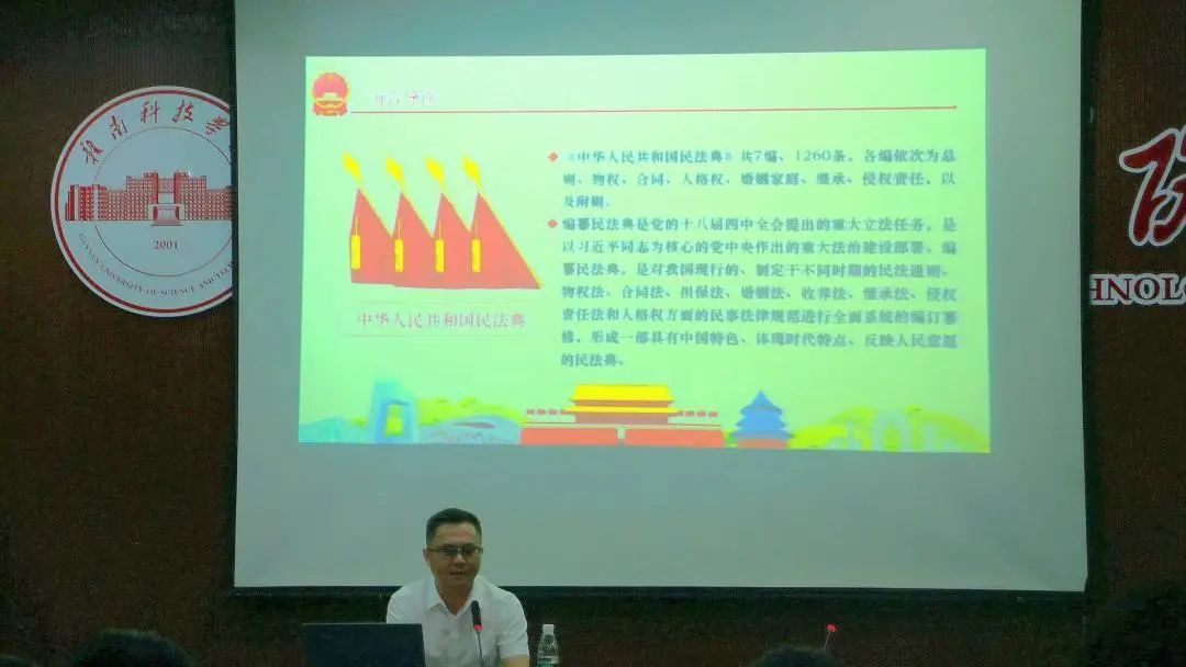 2023年5月23日,支部主委彭斌受bat365中文官方网站的邀请,为该校建设工程系近二百名学生开展了“美好生活.民法典相伴”主题宣讲,向大学生介绍了民法典的相关内容,引导大学生学法、知法、守法、用法,做新时代有担当、勇奉献的奋斗着。