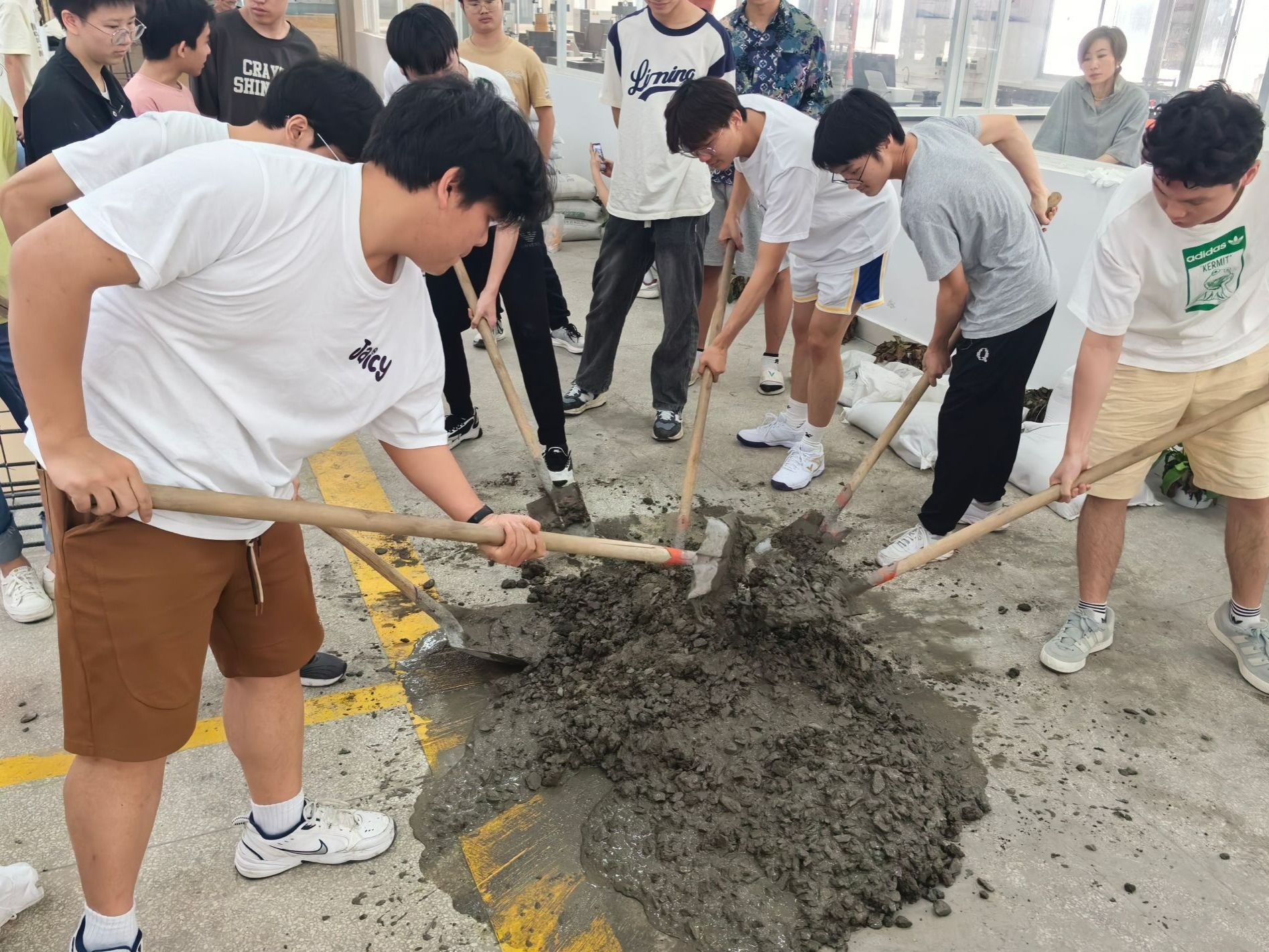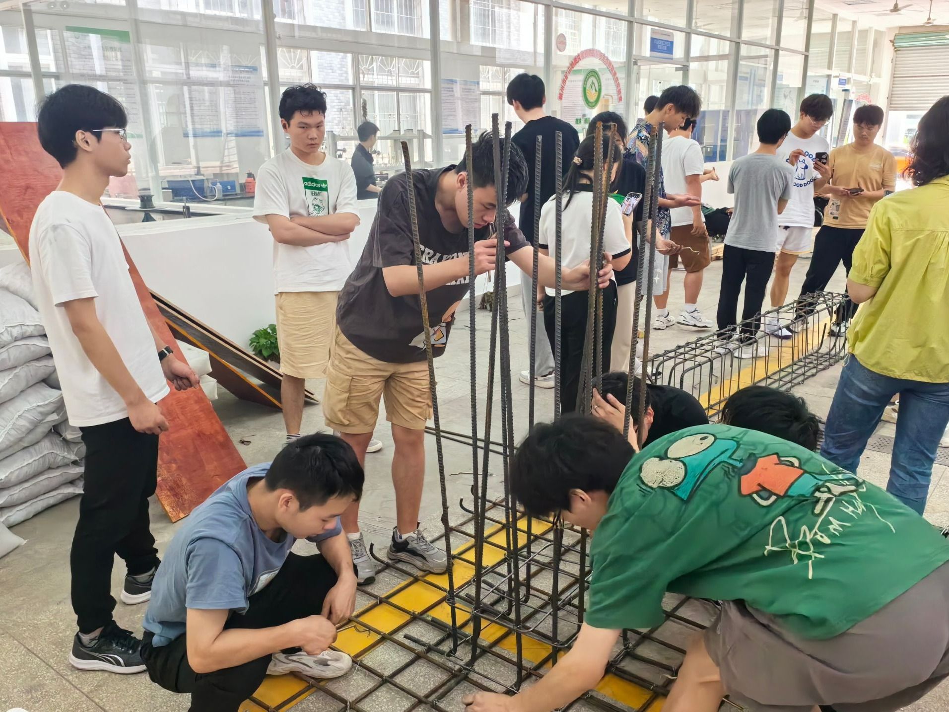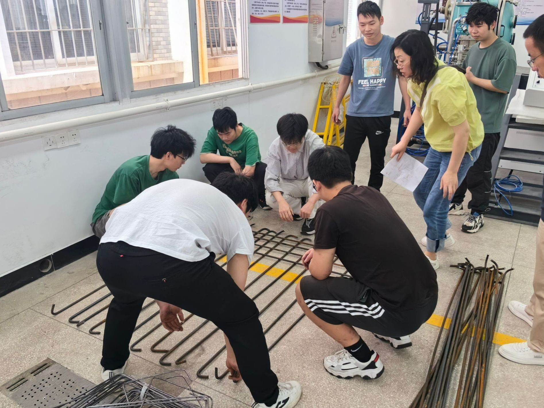 活动现场,共60余名学生们分成若干小组,在校内教师和企业工程师的共同指导下,有条不紊地开展钢筋制作、绑扎,以及混凝土搅拌和浇筑等工作。教师们耐心讲解每个步骤的要点和注意事项,确保学生们能够正确掌握操作技巧。企业工程师则结合自身丰富的工程实践经验,为学生们提供了宝贵的指导和建议。