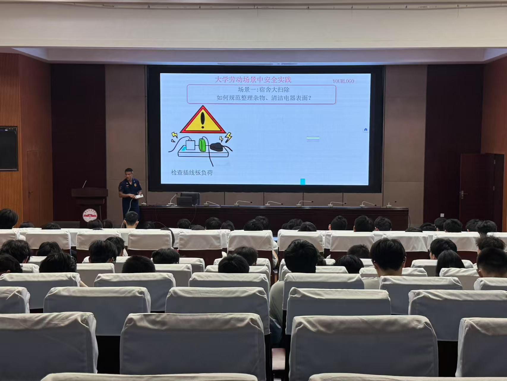 讲座伊始,俞家宝以自身丰富的消防救援经验为依托,分享消防员日常训练、救援的劳动场景,生动阐述了劳动与安全相辅相成的关系。通过互动提问,引导学生思考若消防员不保养装备、不清理消防通道会产生的后果,同时展示大学生在实验室、宿舍等场景劳动时存在的安全隐患,如打扫实验室未关电源引发短路、清理宿舍堵塞逃生通道等,给学生们敲响安全警钟。