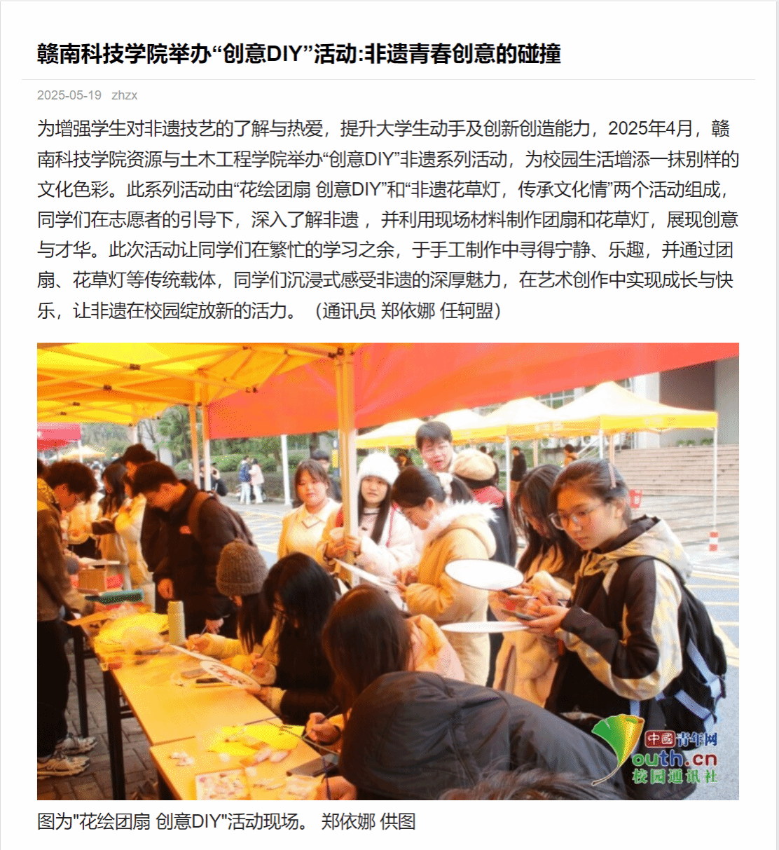 为增强学生对非遗技艺的了解与热爱,提升大学生动手及创新创造能力,2025年4月,bat365中文官方网站bat365中文官方网站举办“创意DIY”非遗系列活动,为校园生活增添一抹别样的文化色彩。此系列活动由“花绘团扇 创意DIY”和“非遗花草灯,传承文化情”两个活动组成,同学们在志愿者的引导下,深入了解非遗 ,并利用现场材料制作团扇和花草灯,展现创意与才华。此次活动让同学们在繁忙的学习之余,于手工制作中寻得宁静、乐趣,并通过团扇、花草灯等传统载体,同学们沉浸式感受非遗的深厚魅力,在艺术创作中实现成长与快乐,让非遗在校园绽放新的活力。(通讯员 郑依娜 任轲盟)