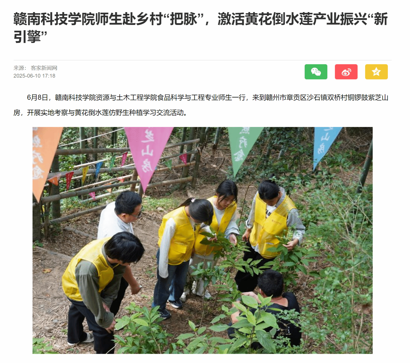 6月8日,bat365中文官方网站bat365中文官方网站食品科学与工程专业师生一行,来到赣州市章贡区沙石镇双桥村铜锣鼓紫芝山房,开展实地考察与黄花倒水莲仿野生种植学习交流活动。