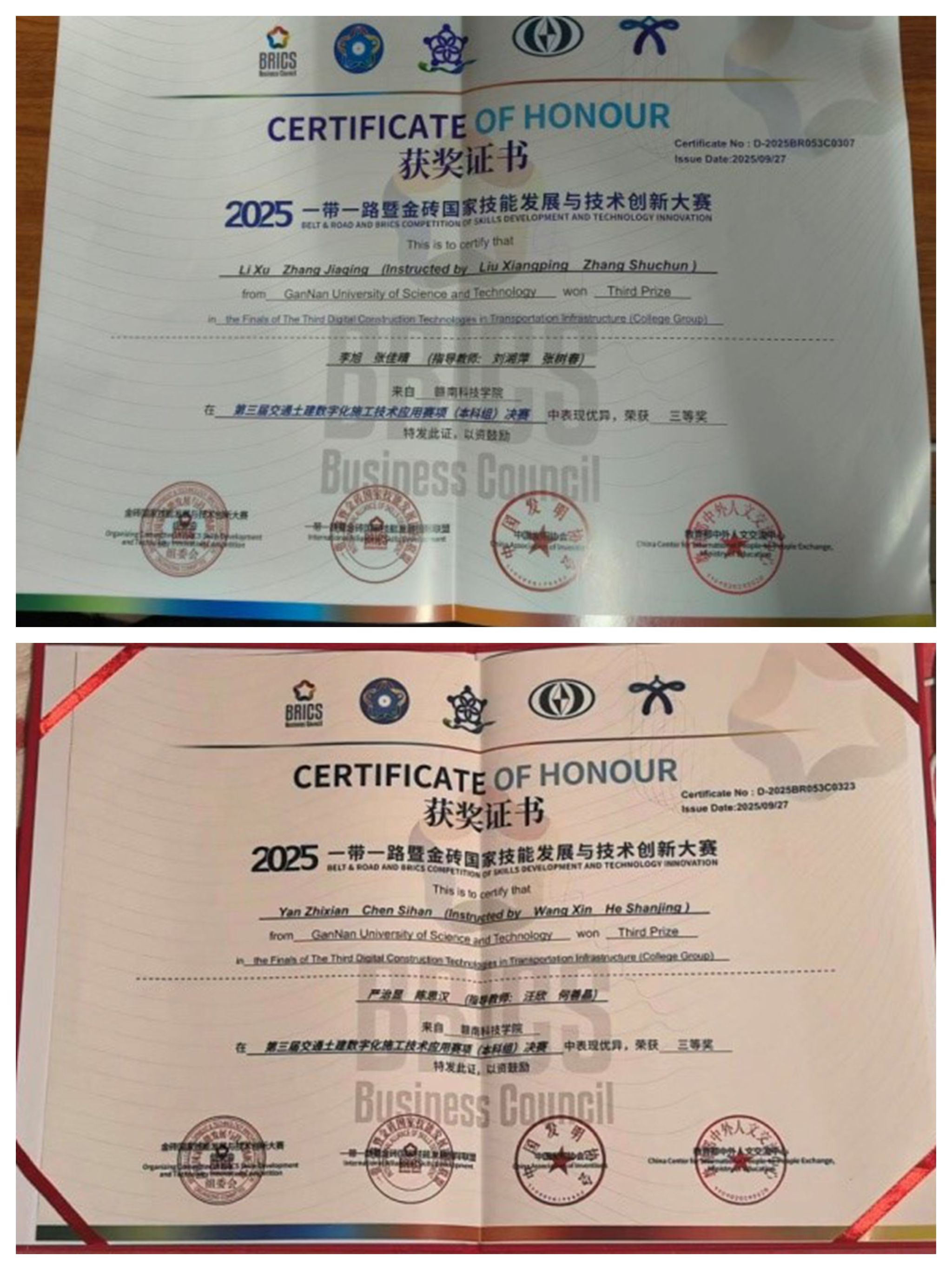 本网讯:近日,由金砖国家工商理事会中方理事会、“一带一路”暨金砖国家技能发展国际联盟、“一带一路”暨金砖国家技能发展与技术创新培训中心主办的2025“一带一路”暨金砖国家技能发展与技术创新大赛第三届交通土建数字化施工技术应用赛项全国总决赛、装配式建筑智能建造技术应用赛项全国总决赛先后在哈尔滨、武汉举办,bat365bat365中文官方网站学子表现出色、捷报频传。