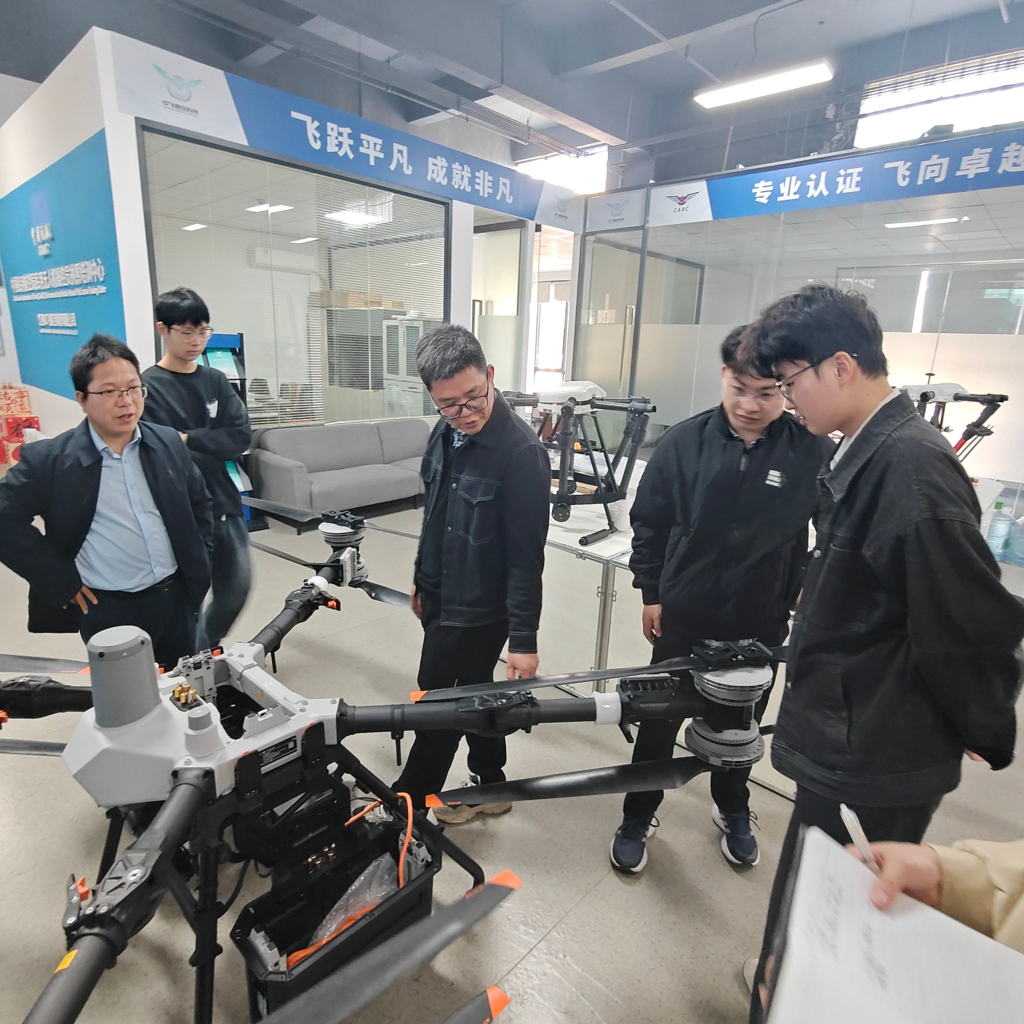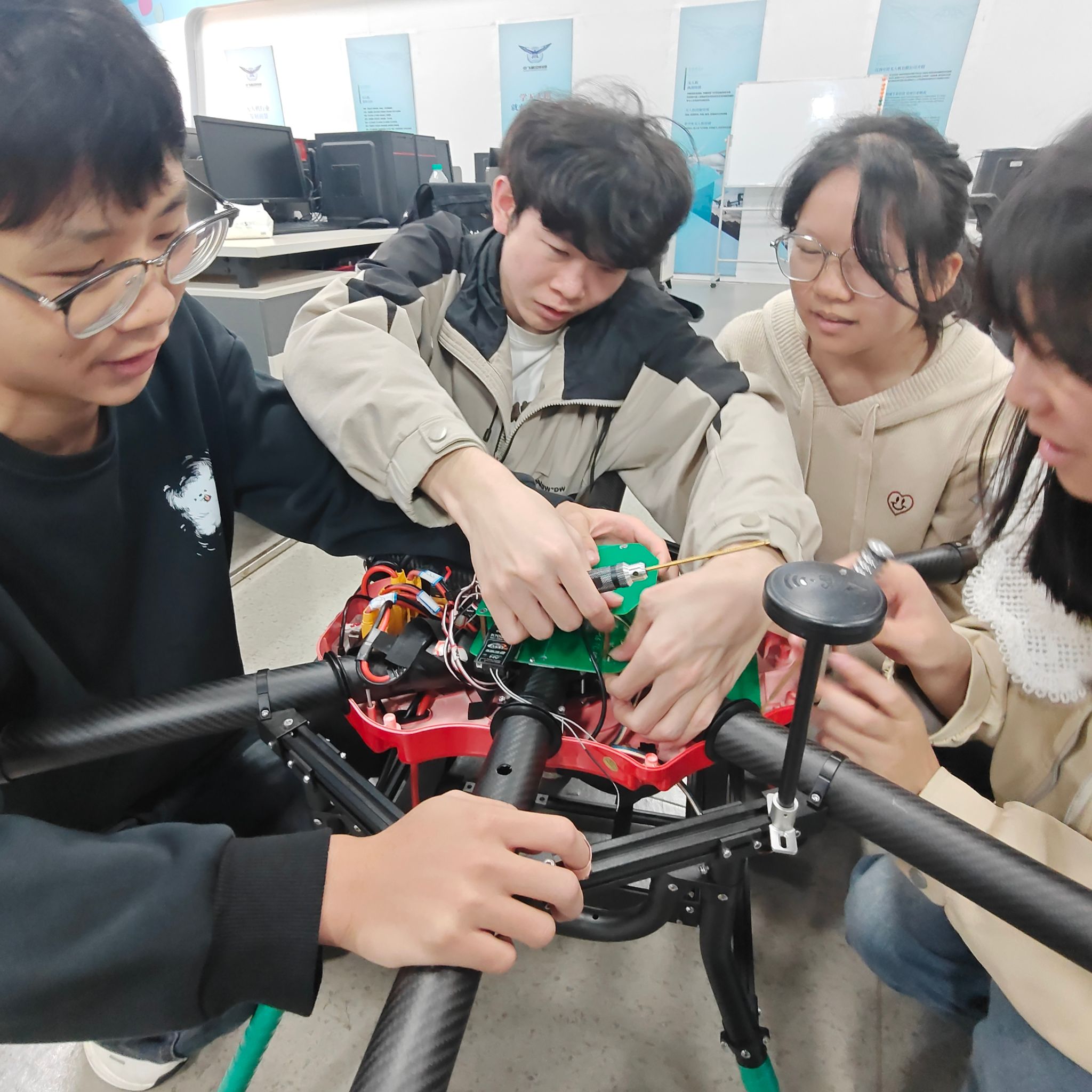 调研过程中,项目团队深入企业实验室与生产一线,观摩多款工业级无人机的动态演示。在廖小建的指导下,学生代表通过拆解无人机机体,系统学习飞控模块、动力系统及传感器布局原理,并结合实物分析飞控算法对飞行稳定性的影响。团队成员围绕“翼”网打“烬”项目中提出的灭火药剂精准投放、高温环境稳定飞行等技术难点,与企业技术团队展开深度交流。一名参与拆解的学生表示:“通过亲手拆装设备,我们对飞控系统的逻辑架构和硬件适配有了更直观的认识,这对优化平台设计非常有启发。”