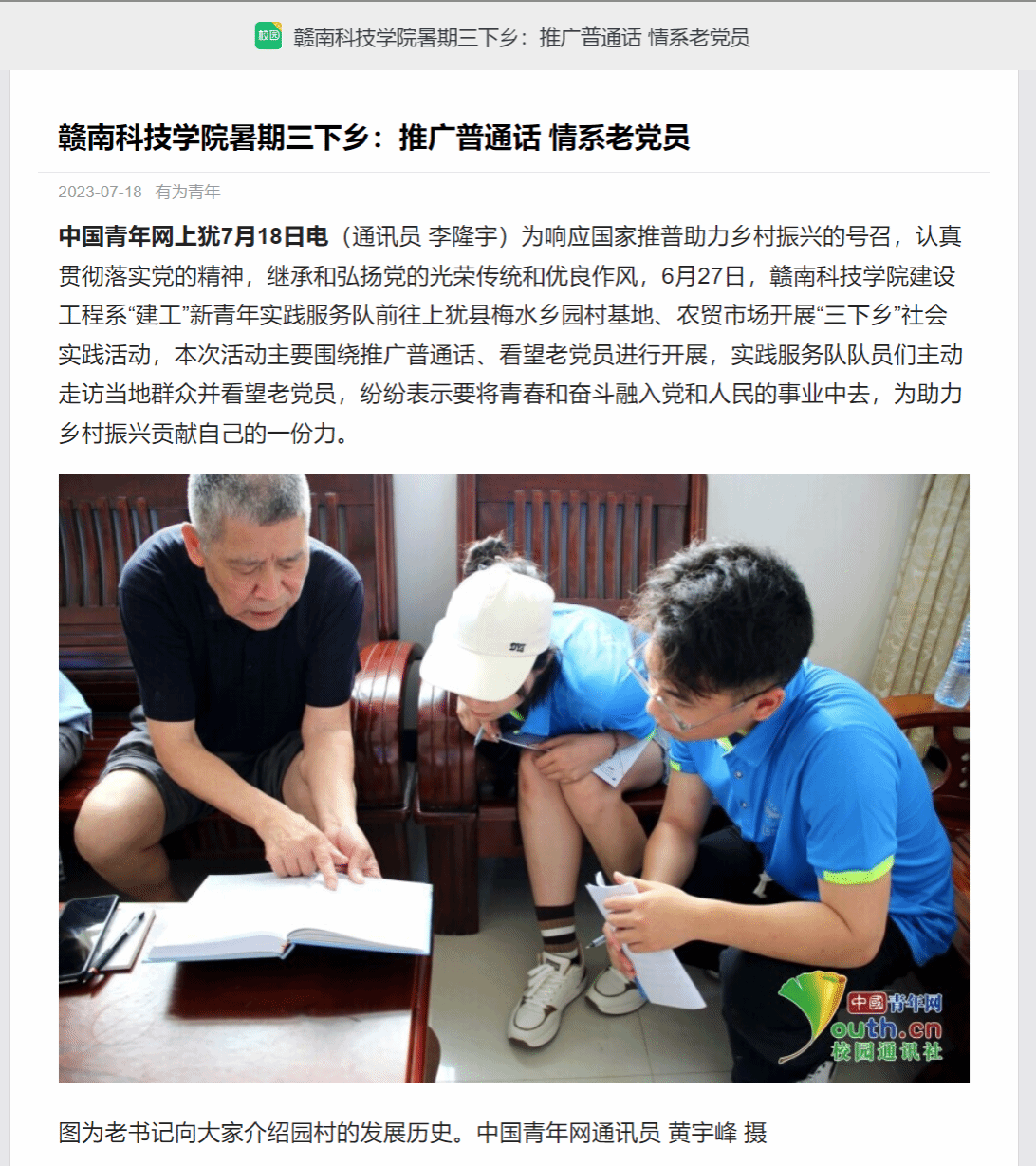 中国青年网上犹7月18日电(通讯员 李隆宇)为响应国家推普助力乡村振兴的号召,认真贯彻落实党的精神,继承和弘扬党的光荣传统和优良作风,6月27日,bat365中文官方网站建设工程系“建工”新青年实践服务队前往上犹县梅水乡园村基地、农贸市场开展“三下乡”社会实践活动,本次活动主要围绕推广普通话、看望老党员进行开展,实践服务队队员们主动走访当地群众并看望老党员,纷纷表示要将青春和奋斗融入党和人民的事业中去,为助力乡村振兴贡献自己的一份力。