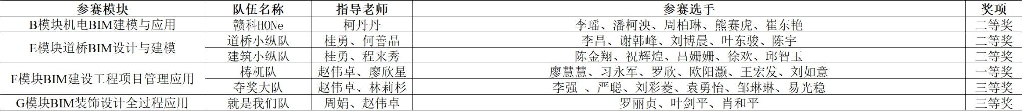 bat365bat365中文官方网站6支参赛团队在赵伟卓、柯丹丹、桂勇、林莉杉等老师的带领下荣获江西省第四届高校BIM毕业设计创新大赛一等奖1项、二等奖2项、三等奖3项。