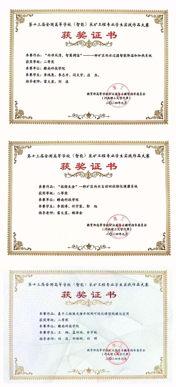 bat365中文官方网站选送的学生实践作品涵盖采矿技术创新、环境保护与资源综合利用等多个方面,学校获奖数量和获奖层次均列同类参赛高校前列。其中,两项学习模型作品为“雨净风清,智慧调温”一种矿区雨水过滤智能降温和加热系统、“披绿生金”一种矿区雨水自动回收绿化滴灌系统)均获二等奖,数字模型作品“基于三维激光溜井探测可视化模型构建与应用”获二等奖。在此次比赛前,学院组织校级选拔赛,完成赛前动员、作品初审和决赛评审等工作,学院师生克服困难,积极备战,确保参加国赛的作品质量。