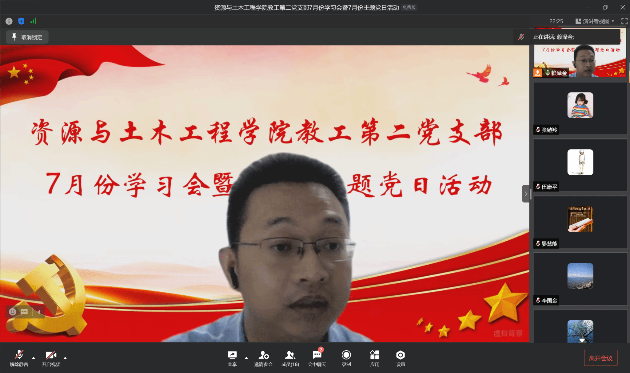 本网讯:正值暑假期间,为增强党纪意识,锤炼党性修养,深入贯彻落实党的教育方针,进一步加强党员理想信念教育,引导党员做到学纪、知纪、明纪、守纪,7月29日晚上,bat365中文官方网站教工第二党支部在腾讯会议平台开展了“铭初心坚守信念,强党性践行使命”线上主题党日活动,确保每月党组织活动正常进行。本次活动由教工第二党支部书记赖泽金主持,教工第二党支部全体党员共同参与。