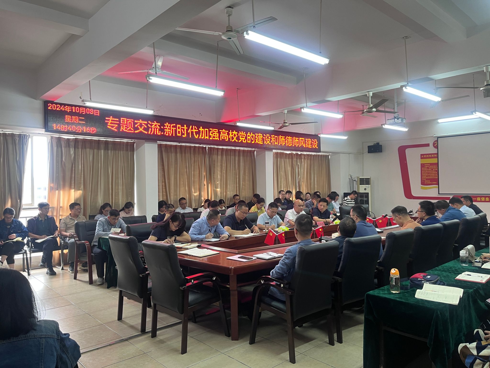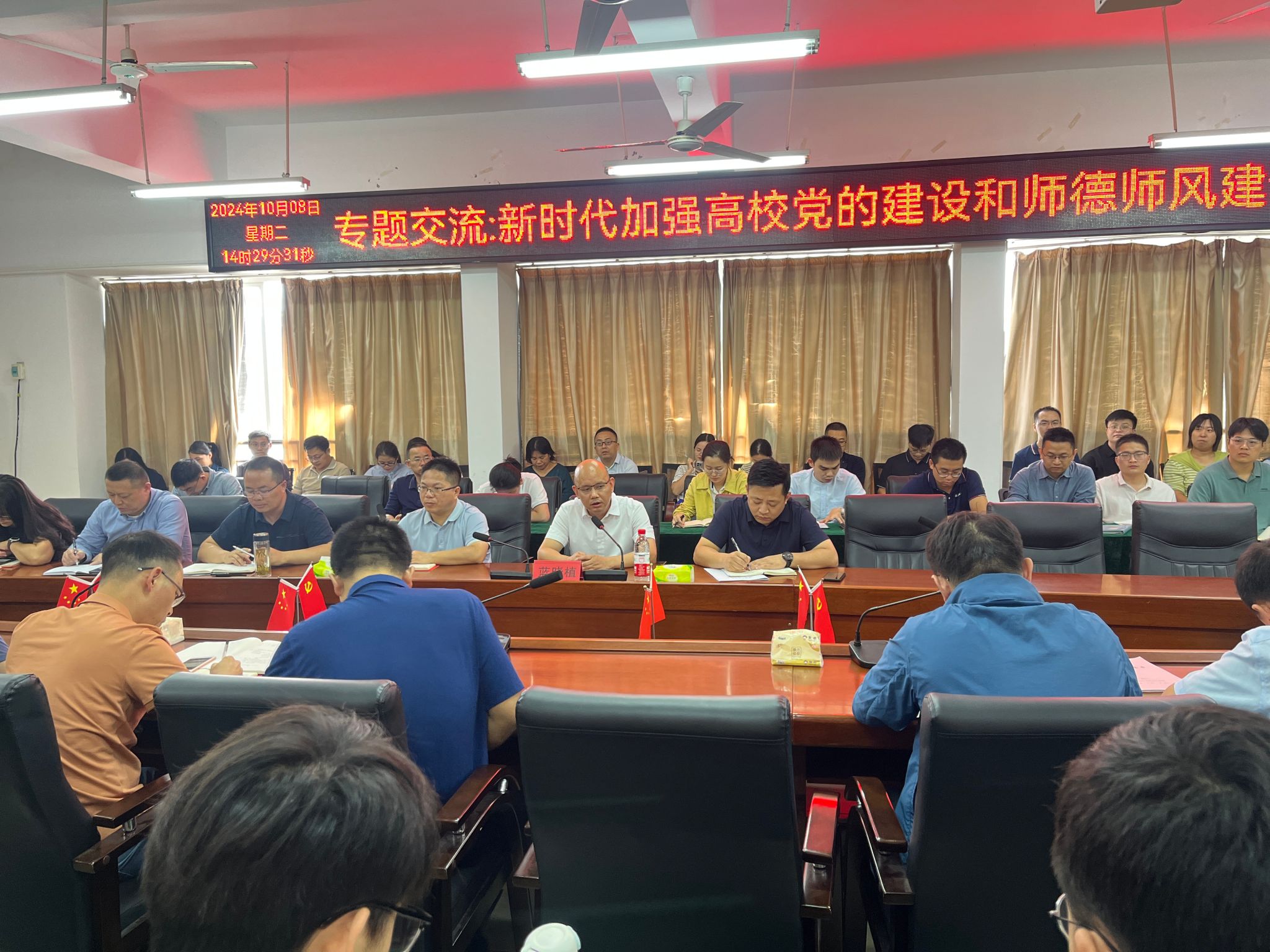 本网讯:10月8号下午,bat365中文官方网站邀请学校党委委员、组织人事部部长蓝晓植为全体教职工开展题为“新时代加强高校党的建设和师德师风建设”的专题交流讲座。本次专题交流讲座在崇善楼Z713会议室举行,bat365中文官方网站全体教职工共同聆听学习,讲座由卢志刚主持。