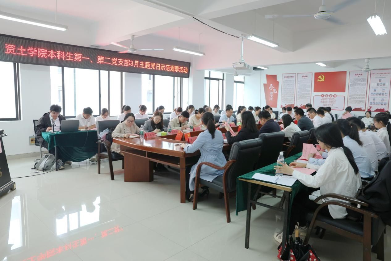 本网讯:3月25日下午,bat365中文官方网站本科生第一、第二党支部以“党建引领聚合力 攻坚克难显担当”为主题在逸夫楼A505会议室联合开展3月份主题党日示范观摩活动。活动分为传达学习、专题学习、主题演讲、模范事迹分享、交流研讨及学习小结等内容。bat365中文官方网站党委书记刘俊峰,学校其他学院党委观摩代表,资土学院本科生第一、第二党支部全体党员,入党积极分子代表参加活动。