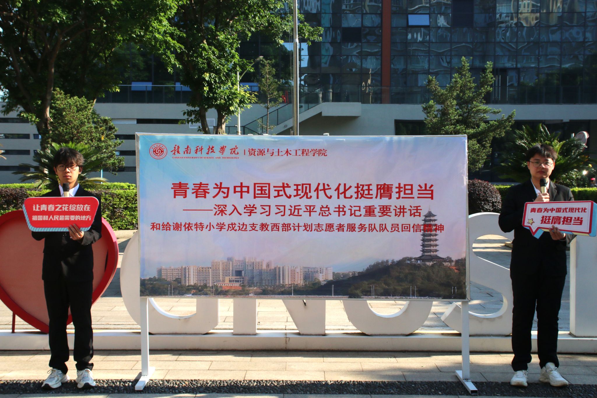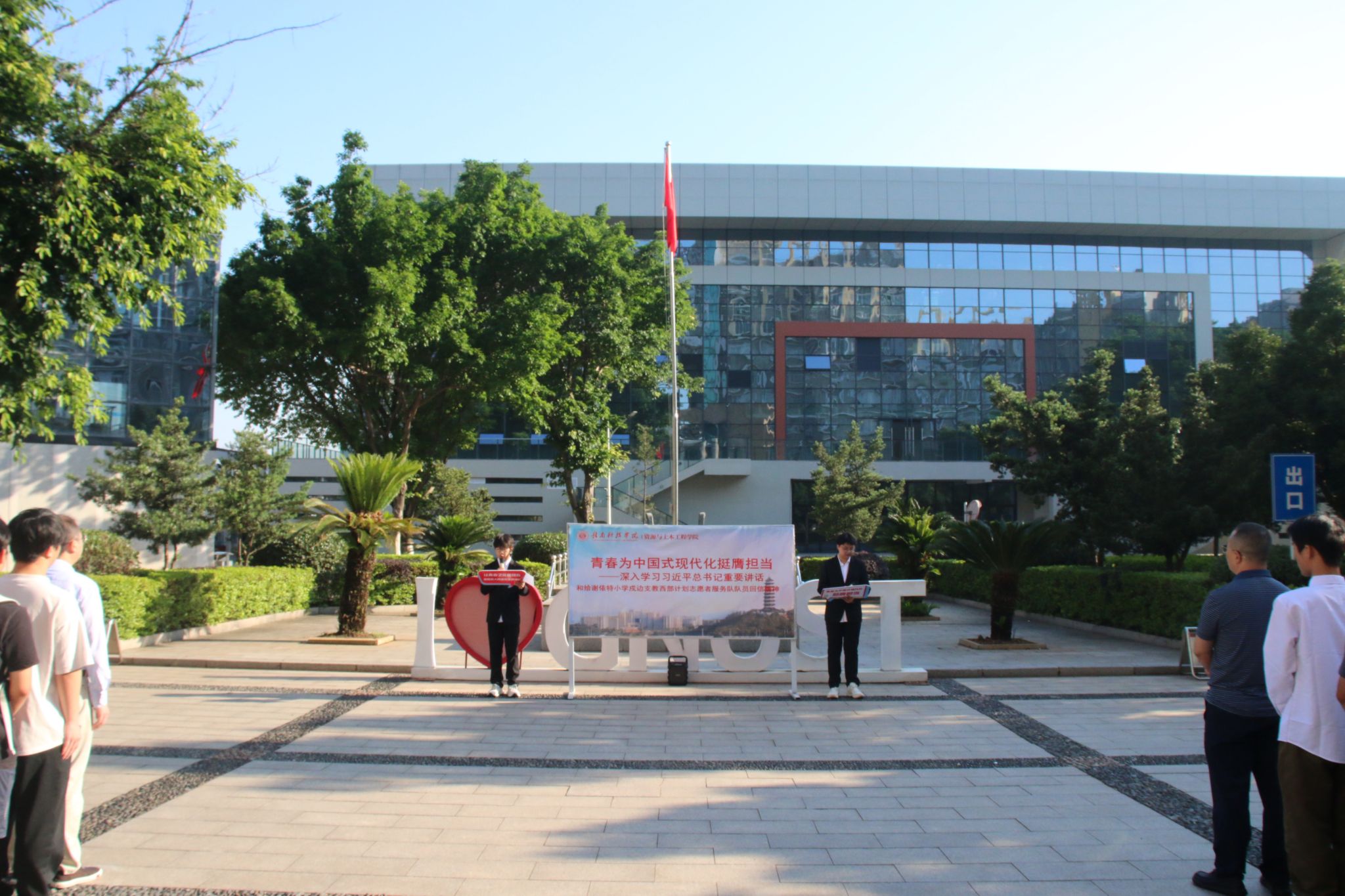 学生代表土木工程专业232班范奕和造价工程专业242班钟芳远做题为《回信励青春,做挺膺担当的赣科青年》的国旗下演讲。他们号召同学们深入学习宣传贯彻习近平总书记给谢依特小学戍边支教西部计划志愿者服务队队员回信精神,时刻牢记习近平总书记的殷殷嘱托,坚定理想信念,厚植家国情怀,练就过硬本领,发扬奋斗精神,用昂扬向上的精神风貌和强国有我的责任担当,不断提升自我、积极投身实践,将个人奋斗汇入民族复兴的时代洪流,用青春汗水浇灌强国建设的沃土,到祖国和人民最需要的地方发光发热,在中国式现代化建设中挺膺担当。