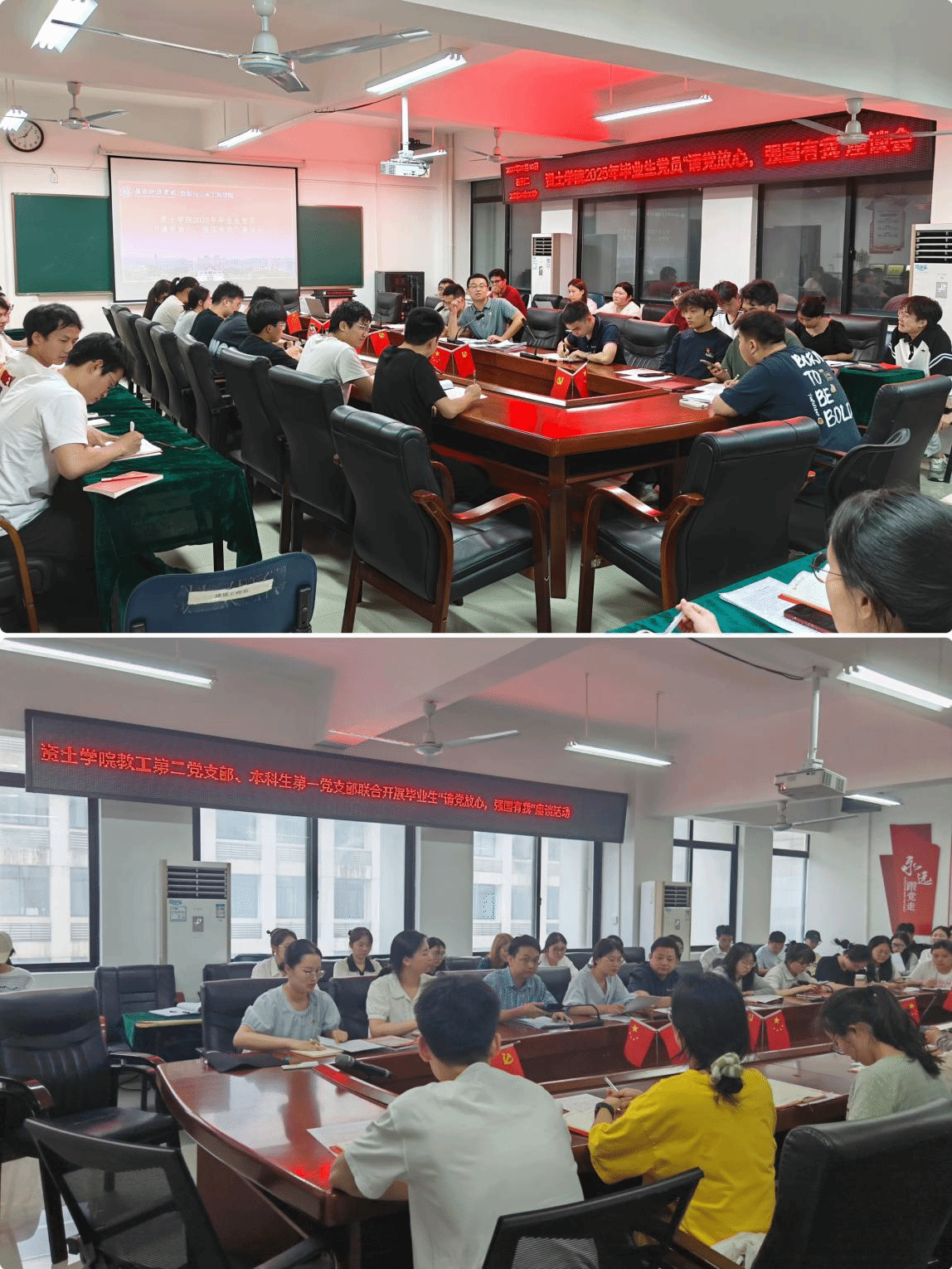毕业生党员座谈,共话青春担当。学院教工第一党支部和本科生第二党支部、教工第二党支部和本科生第一党支部分别联合开展了“请党放心,强国有我”毕业生座谈活动。在座谈会上,毕业生党员们回顾了自己的大学生活和入党历程,分享了成长感悟和未来规划,各党支部将学校组织人事部精心为每一位毕业生党员定制的“毕业寄语”送到了46名党员毕业生手中。他们纷纷表示,将牢记党组织的嘱托,在新的人生道路上继续发挥共产党员的先锋模范作用,以“请党放心,强国有我”的坚定信念,为实现中华民族伟大复兴的中国梦贡献自己的力量。