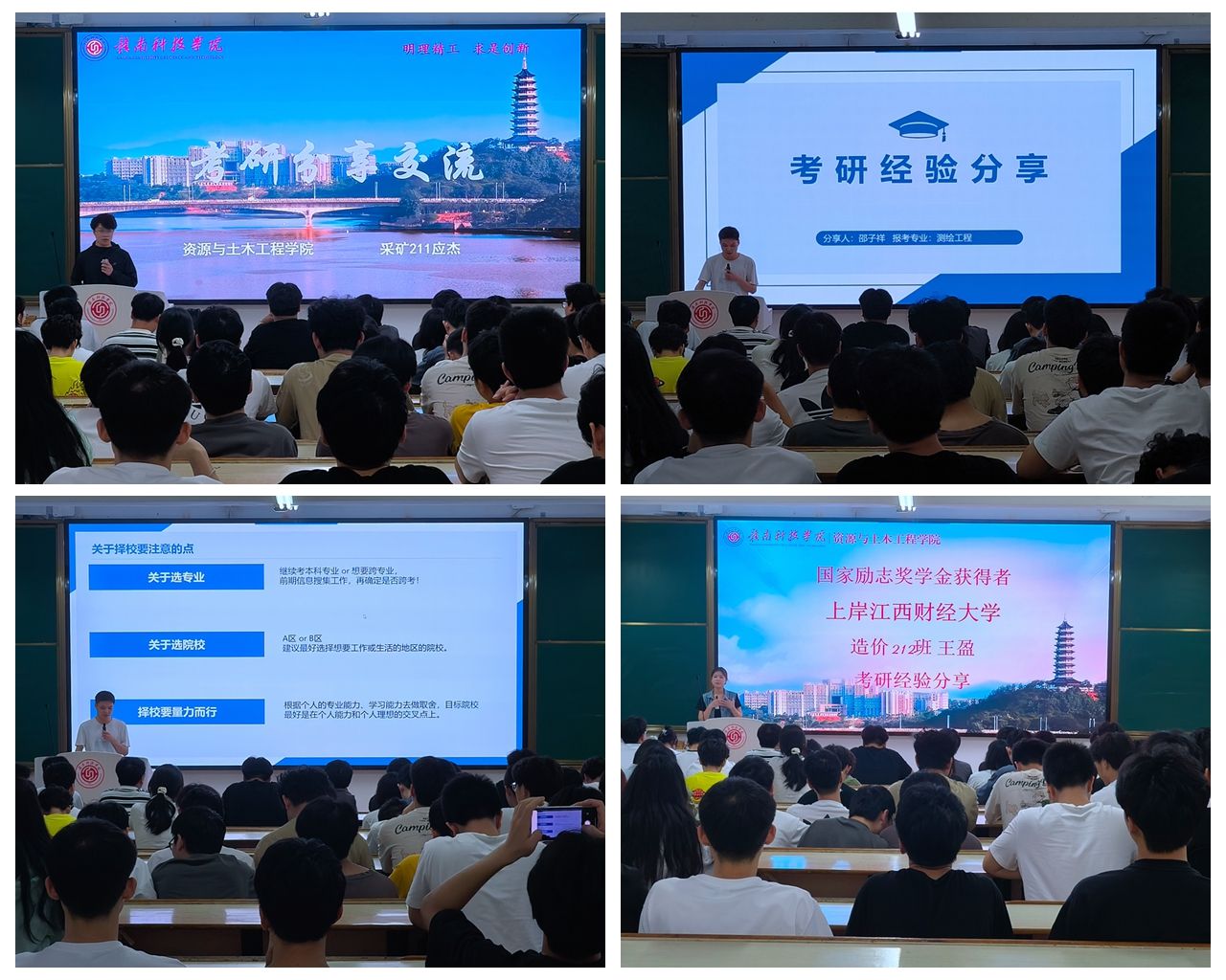 在优秀学生代表发言环节,采矿211班应杰、测绘212班邵子祥、造价212班王盈三位学子结合自身经历,分享了他们的奋斗故事与成长感悟。国家奖学金获得者、学校第十三届十佳大学生获得者、成功考入北京科技大学的应杰首先登台,他分享了自己的时间管理与学习方法,向同学们展现了持之以恒的力量;国家励志奖学金获得者、录取至中国地质大学(北京)的邵子祥从备考规划、心态调整等方面为考研学子提供了宝贵建议;上岸江西财经大学研究生的王盈则以学科交叉为切入点,分享了跨专业考研的成功经验。三位同学的真诚分享赢得了现场阵阵掌声,充分展现了bat365中文官方网站学子自强不息、感恩奋进的精神风貌。