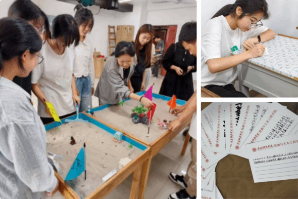活动现场,同学们借助矿石、彩色旗帜等材料,在沙盘上标记出学习、生活等多方面的压力源,并在沙盘中挖出属于自己的心灵矿石;随后同学们依次走向“情绪垃圾桶”丢弃矿石,郑重地丢弃象征负面情绪的矿石,用充满仪式感的方式与烦恼告别,完成一场心灵的净化仪式;活动尾声,大家纷纷执笔,将参与活动时的触动与感悟落于纸上,字里行间满是对未来积极乐观生活的期许。