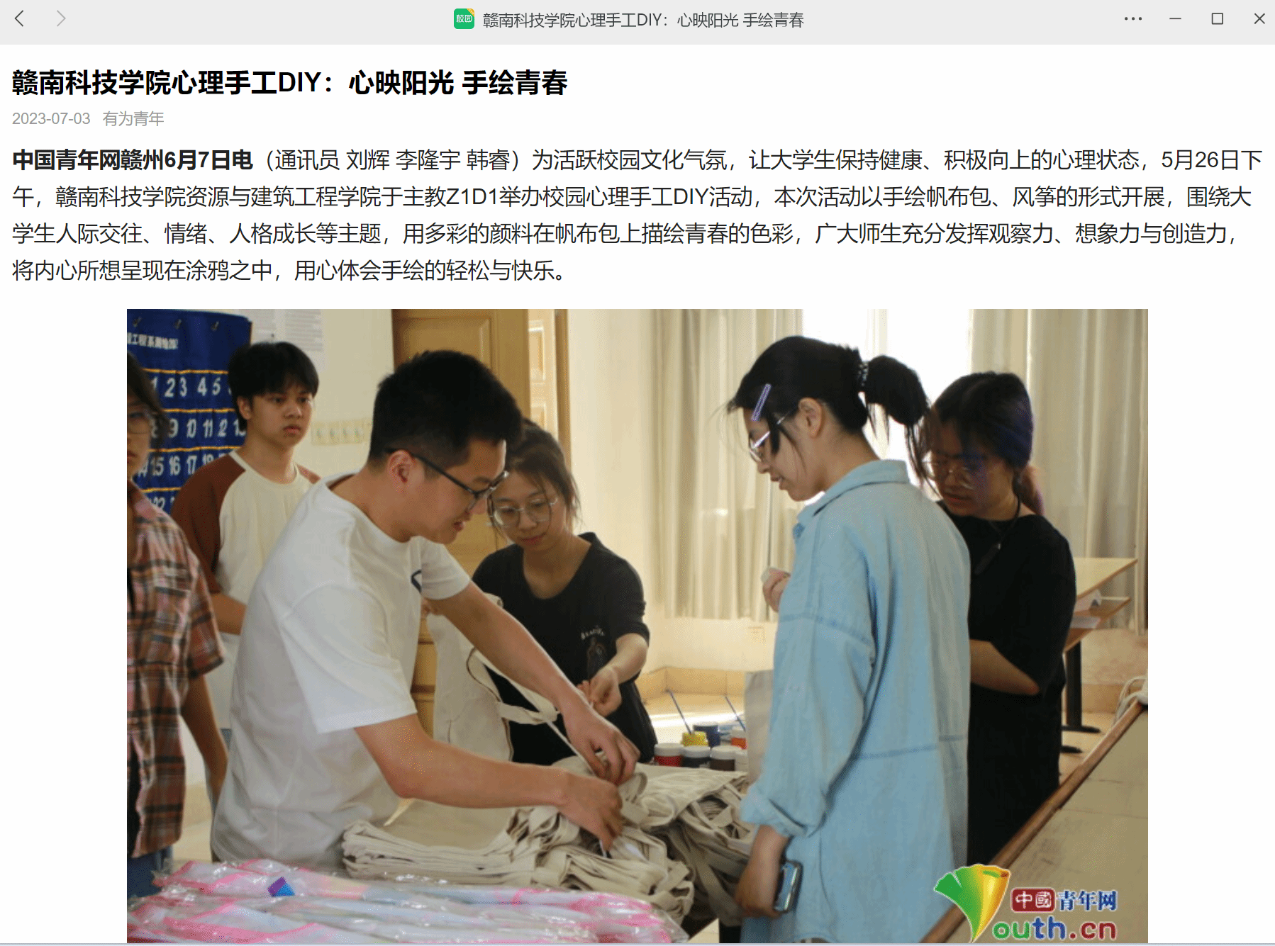 中国青年网赣州6月7日电(通讯员 刘辉 李隆宇 韩睿)为活跃校园文化气氛,让大学生保持健康、积极向上的心理状态,5月26日下午,bat365中文官方网站资源与建筑工程学院于主教Z1D1举办校园心理手工DIY活动,本次活动以手绘帆布包、风筝的形式开展,围绕大学生人际交往、情绪、人格成长等主题,用多彩的颜料在帆布包上描绘青春的色彩,广大师生充分发挥观察力、想象力与创造力,将内心所想呈现在涂鸦之中,用心体会手绘的轻松与快乐。