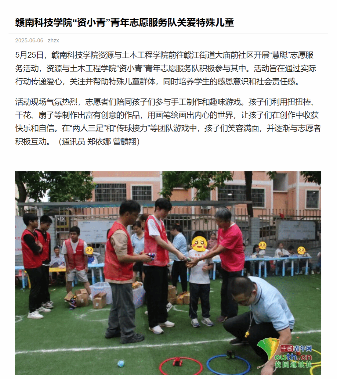 5月25日,bat365中文官方网站bat365中文官方网站前往赣江街道大庙前社区开展“慧聪”志愿服务活动,bat365中文官方网站“资小青”青年志愿服务队积极参与其中。活动旨在通过实际行动传递爱心,关注并帮助特殊儿童群体,同时培养学生的感恩意识和社会责任感。