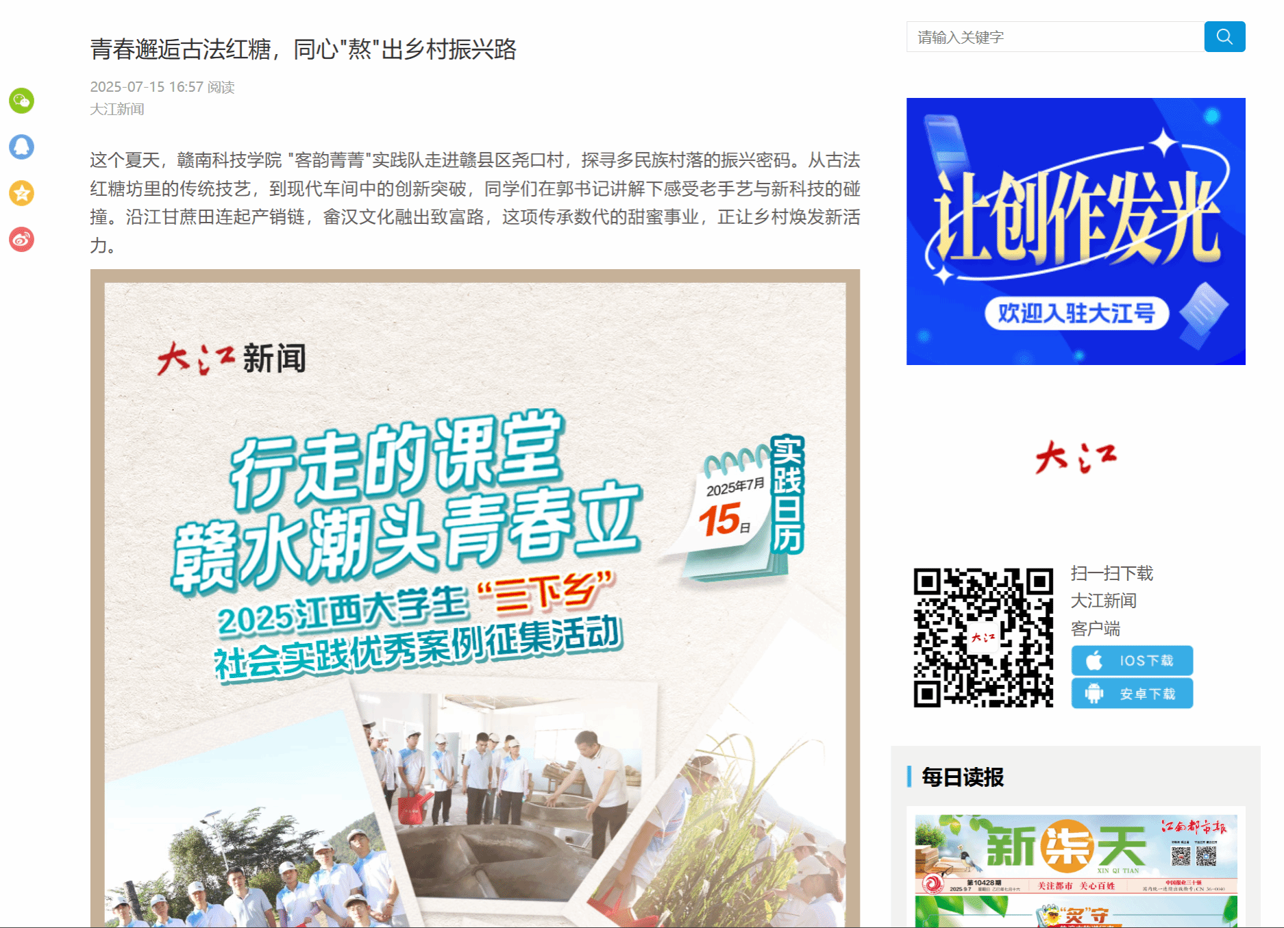 这个夏天,bat365中文官方网站 "客韵菁菁"实践队走进赣县区尧口村,探寻多民族村落的振兴密码。从古法红糖坊里的传统技艺,到现代车间中的创新突破,同学们在郭书记讲解下感受老手艺与新科技的碰撞。沿江甘蔗田连起产销链,畲汉文化融出致富路,这项传承数代的甜蜜事业,正让乡村焕发新活力。