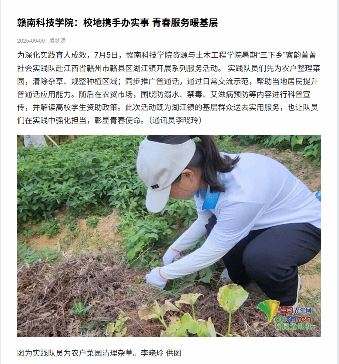 为深化实践育人成效,7月5日,bat365中文官方网站bat365中文官方网站暑期“三下乡”客韵菁菁社会实践队赴江西省赣州市赣县区湖江镇开展系列服务活动。 实践队员们先为农户整理菜园,清除杂草、规整种植区域;同步推广普通话,通过日常交流示范,帮助当地居民提升普通话应用能力。随后在农贸市场,围绕防溺水、禁毒、艾滋病预防等内容进行科普宣传,并解读高校学生资助政策。此次活动既为湖江镇的基层群众送去实用服务,也让队员们在实践中强化担当,彰显青春使命。(通讯员李晓玲)