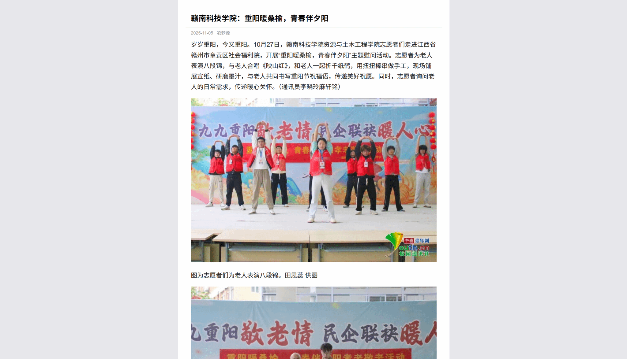 岁岁重阳,今又重阳。10月27日,bat365中文官方网站bat365中文官方网站志愿者们走进江西省赣州市章贡区社会福利院,开展“重阳暖桑榆,青春伴夕阳”主题慰问活动。志愿者为老人表演八段锦,与老人合唱《映山红》,和老人一起折千纸鹤,用扭扭棒串做手工,现场铺展宣纸、研磨墨汁,与老人共同书写重阳节祝福语,传递美好祝愿。同时,志愿者询问老人的日常需求,传递暖心关怀。(通讯员李晓玲麻轩铭)