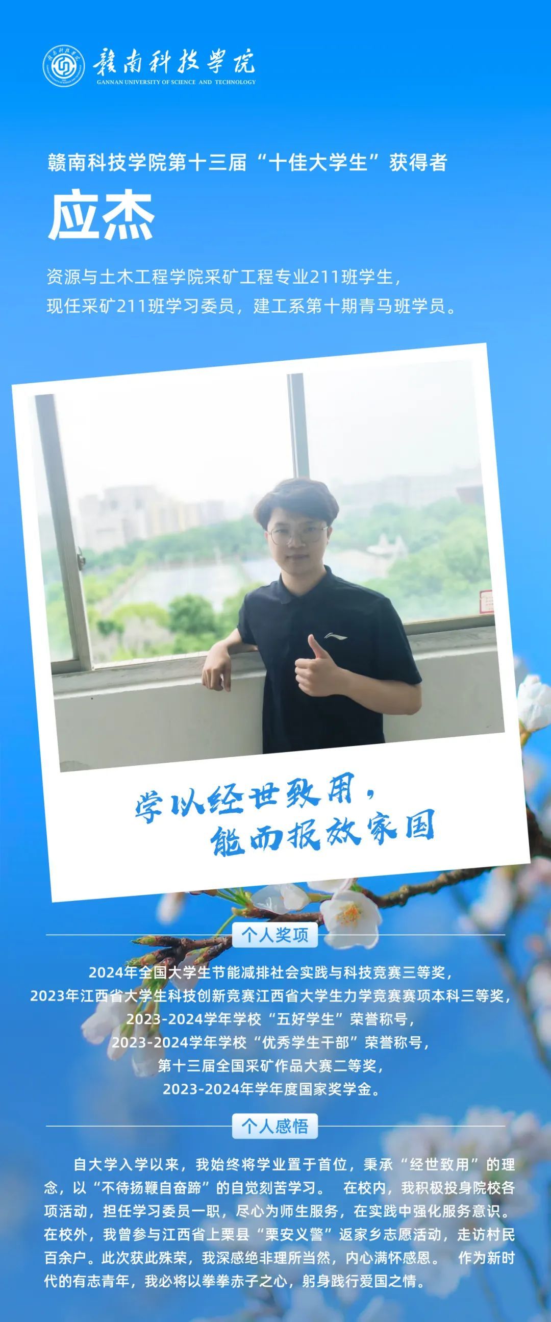 榜样引领|第十三届“十佳大学生”采矿211应杰
