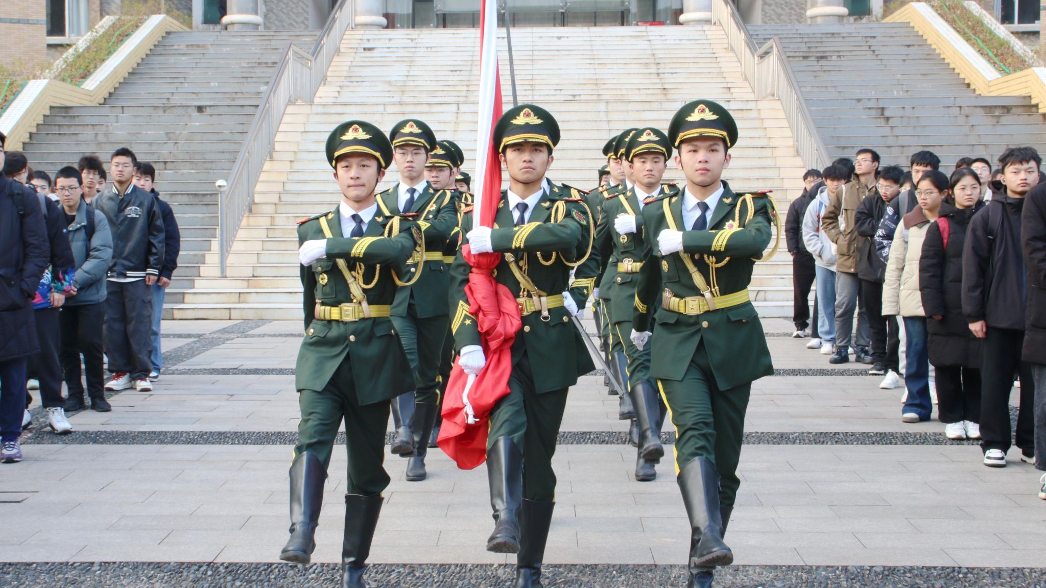 升旗仪式在庄严肃穆、振奋人心的氛围中开始,国旗护卫队迈着铿锵有力的步伐,护送国旗入场。随着激昂的《义勇军进行曲》响起,全体师生行注目礼。